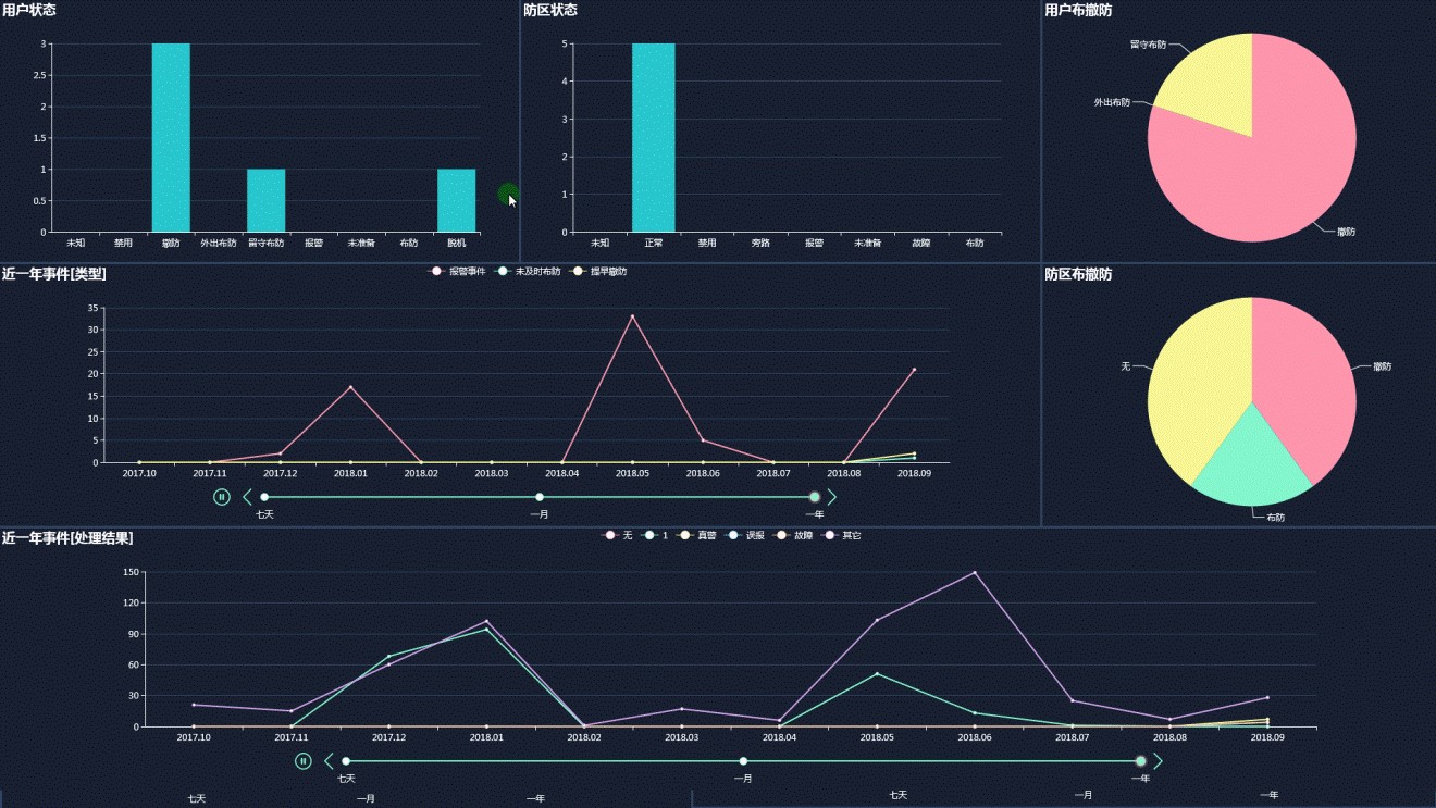 ? 具備報(bào)警系統(tǒng)事件查詢統(tǒng)計(jì)的智能報(bào)表功能,報(bào)表會隨著報(bào)警用戶及防區(qū)點(diǎn)位狀態(tài)、事件的變化而自動實(shí)時動態(tài)更新,令日常操作更加直觀及智能化。